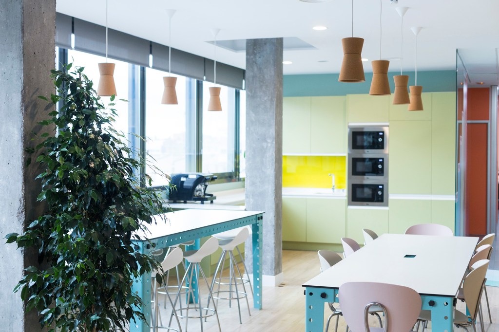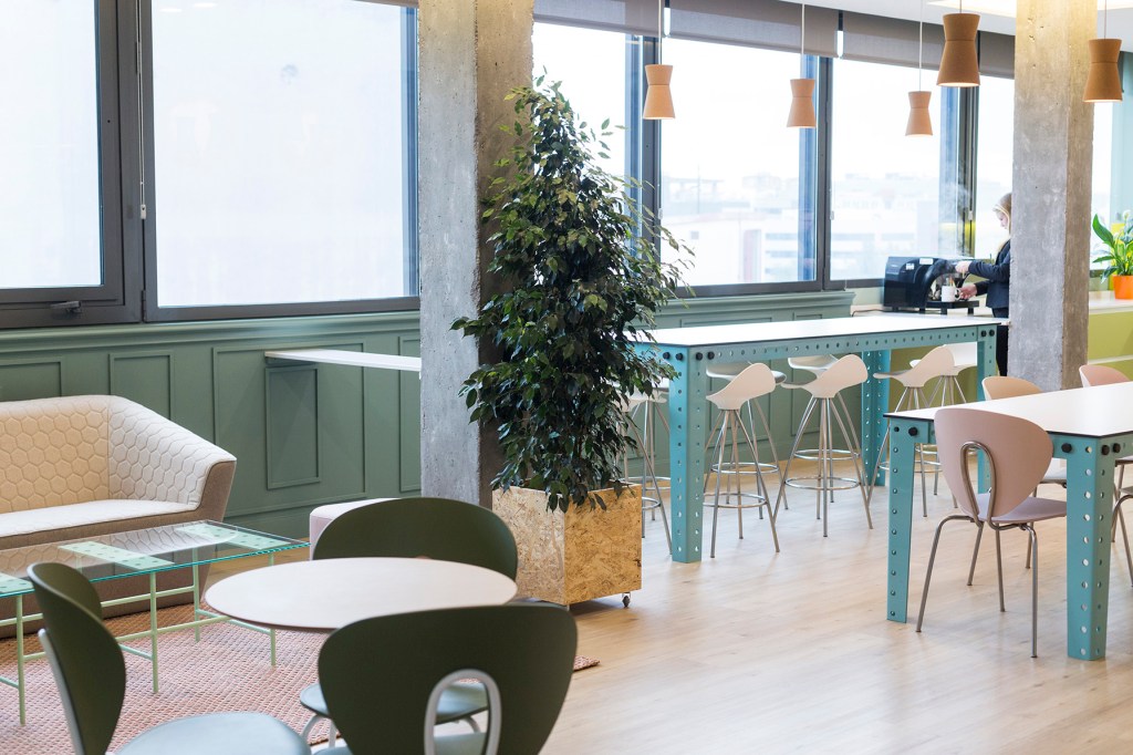 Para este proyecto de oficinas en Madrid, donde se ampliaba la superficie, se nos planteó diseñar una zona que acogiera el comedor, la cocina y también un lugar que facilitara poder reunirse o trabajar de manera más informal.
